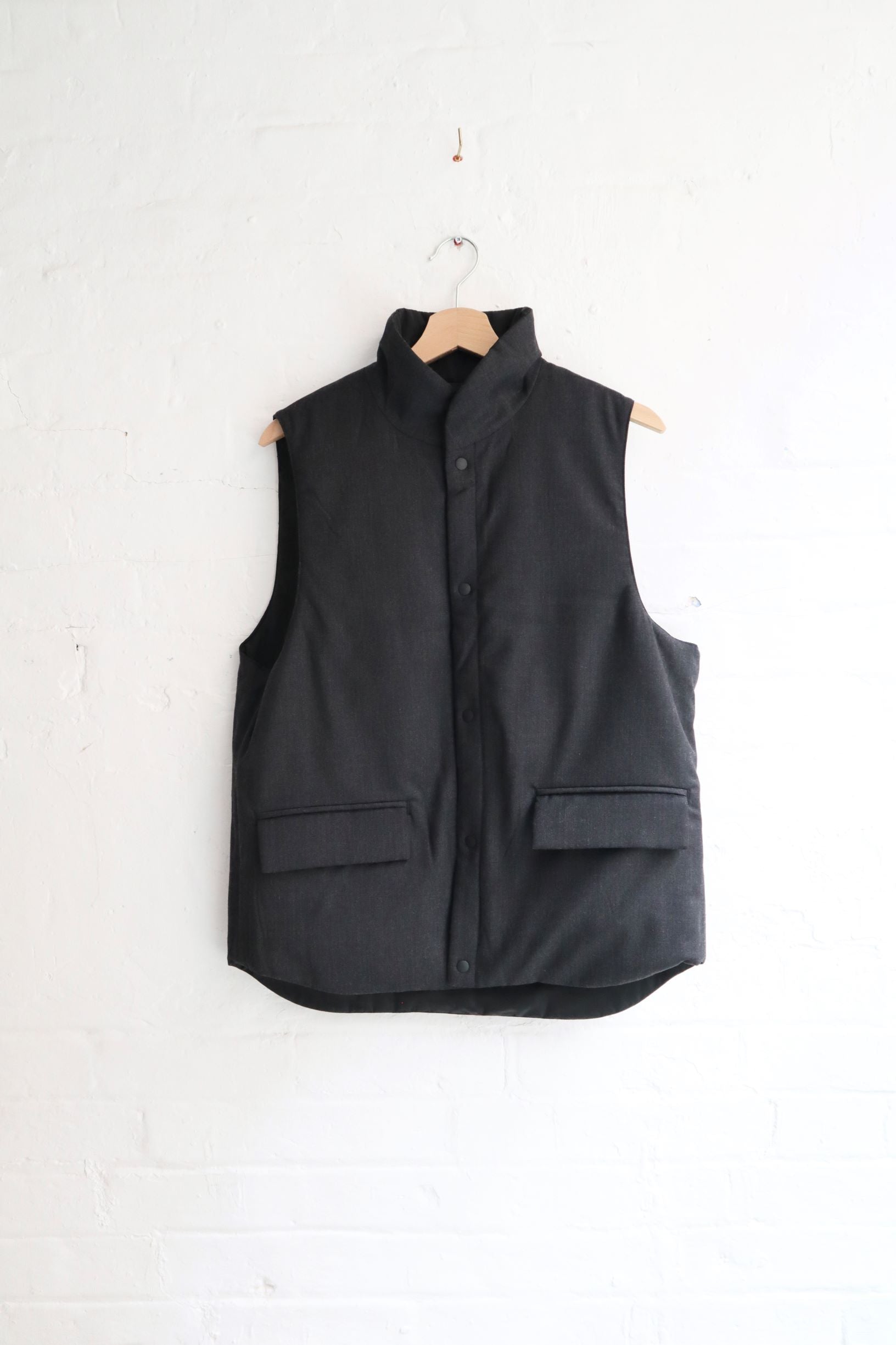 A reversible insulated vest designed for effortless layering. One side features a subtle sheen with water-repellent polyester and padded utility pockets, the other offers a clean, dry touch with wool-blend serge and classic flap pockets.
