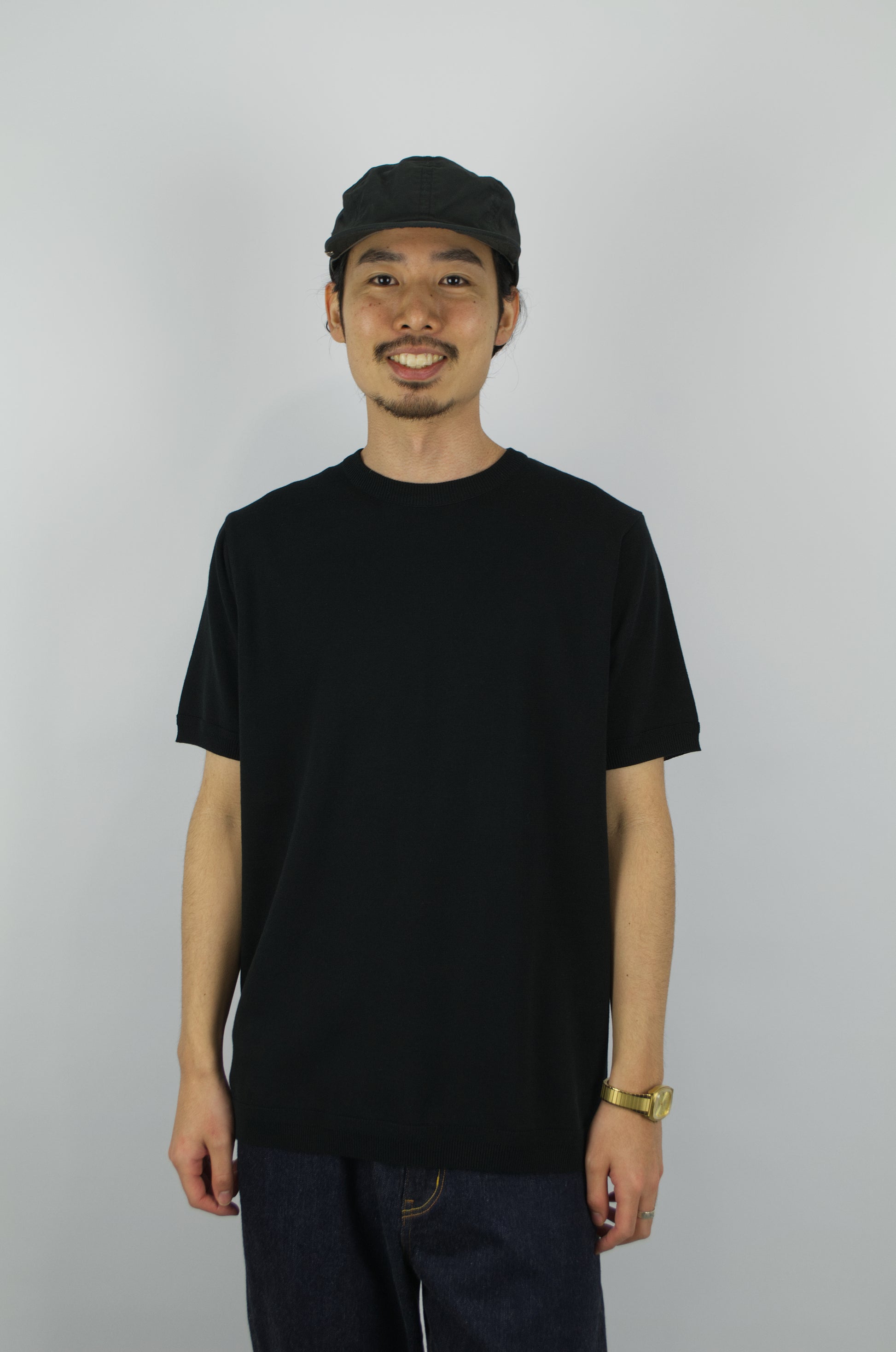 Fujito's signature Knit T-Shirts in a Pure Black 100% Cotton Knit. Inspired by knitted T's of the 60s they're cut from a high-gauge knit cotton jersey and have a great mix of elasticity, breathability and moisture absorption, making them ideal for the hotter months.