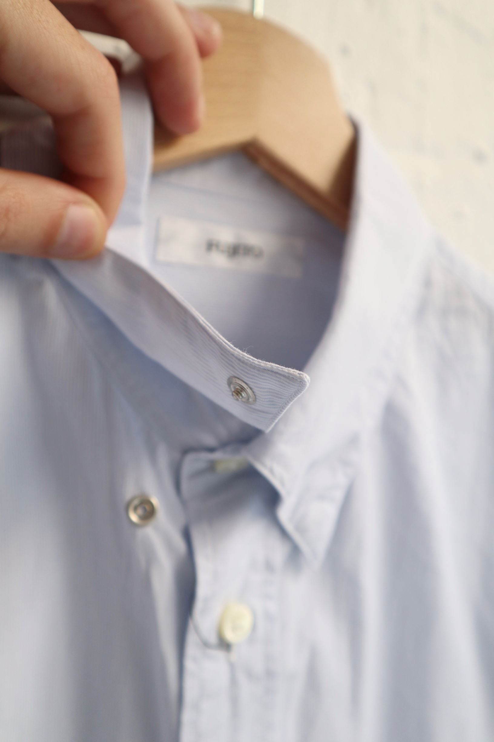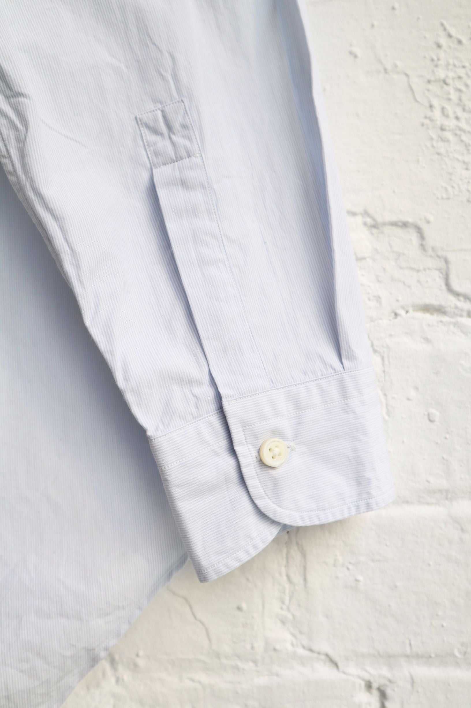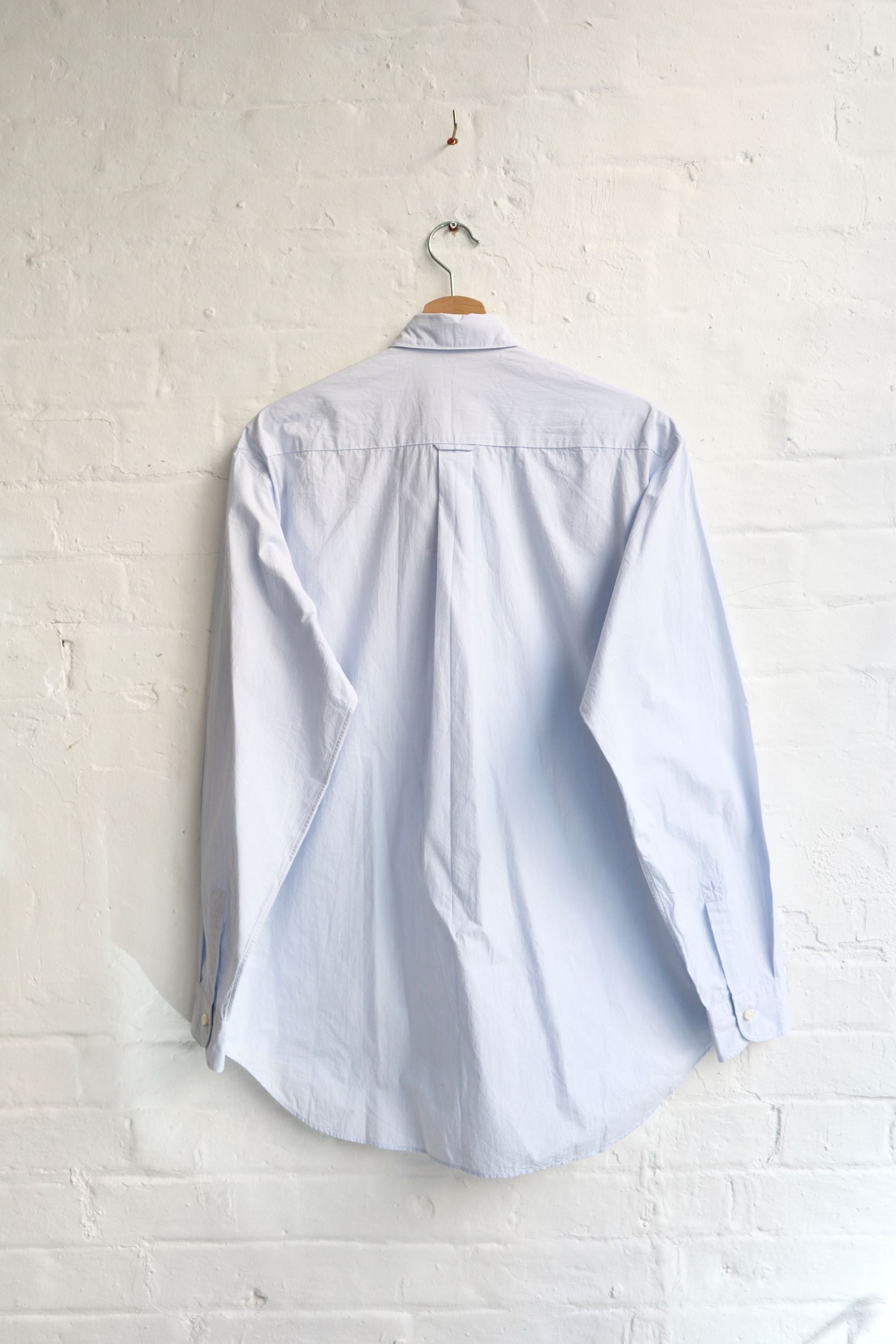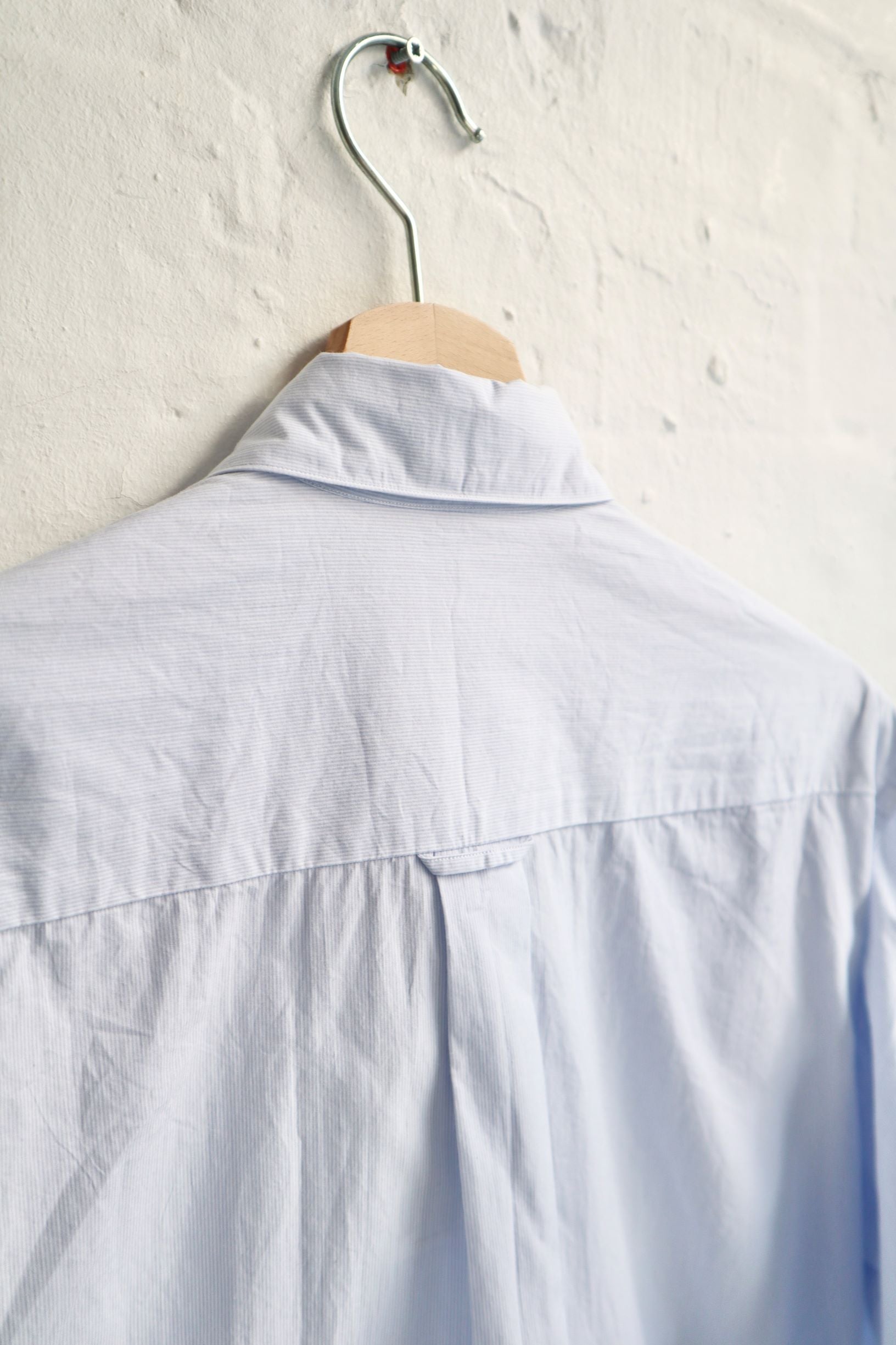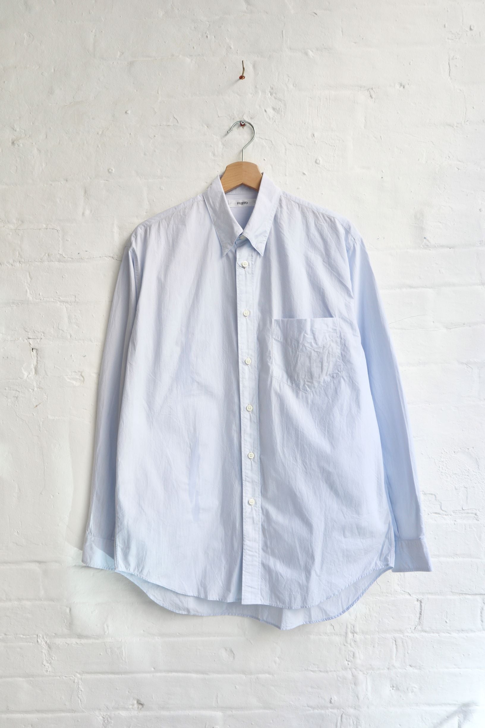 This shirt features a unique Button-down collar with a concealed 'snap' press studs. It also features a box pleat from the back yoke, 2 pleated sleeves and a single 'shield' chest pocket.