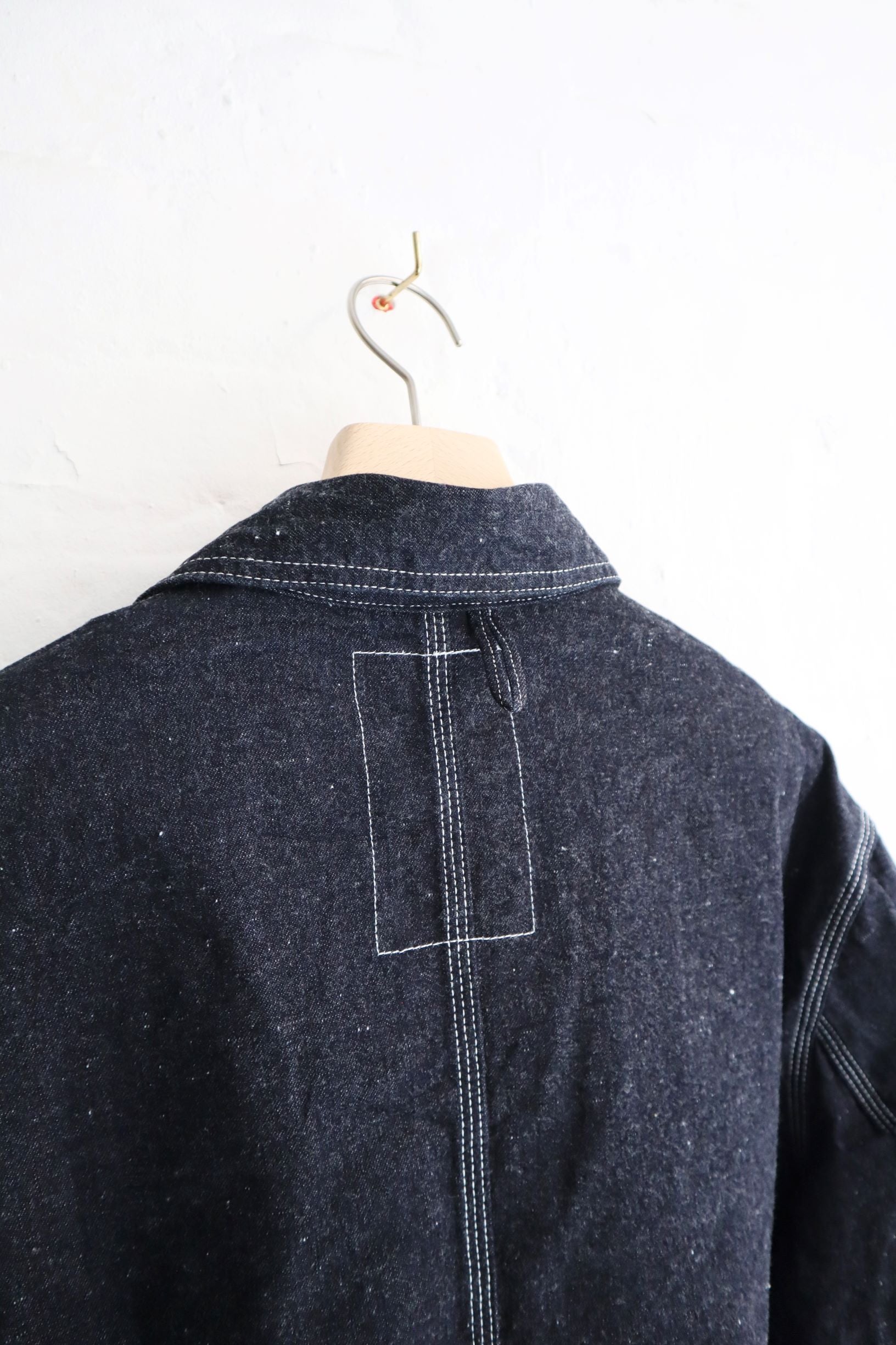A modern interpretation of a classic 1930s coverall chore jacket. Cut from a neppy, 10.5oz denim win a dark one wash indigo with lots of texture and character that returns with washing.