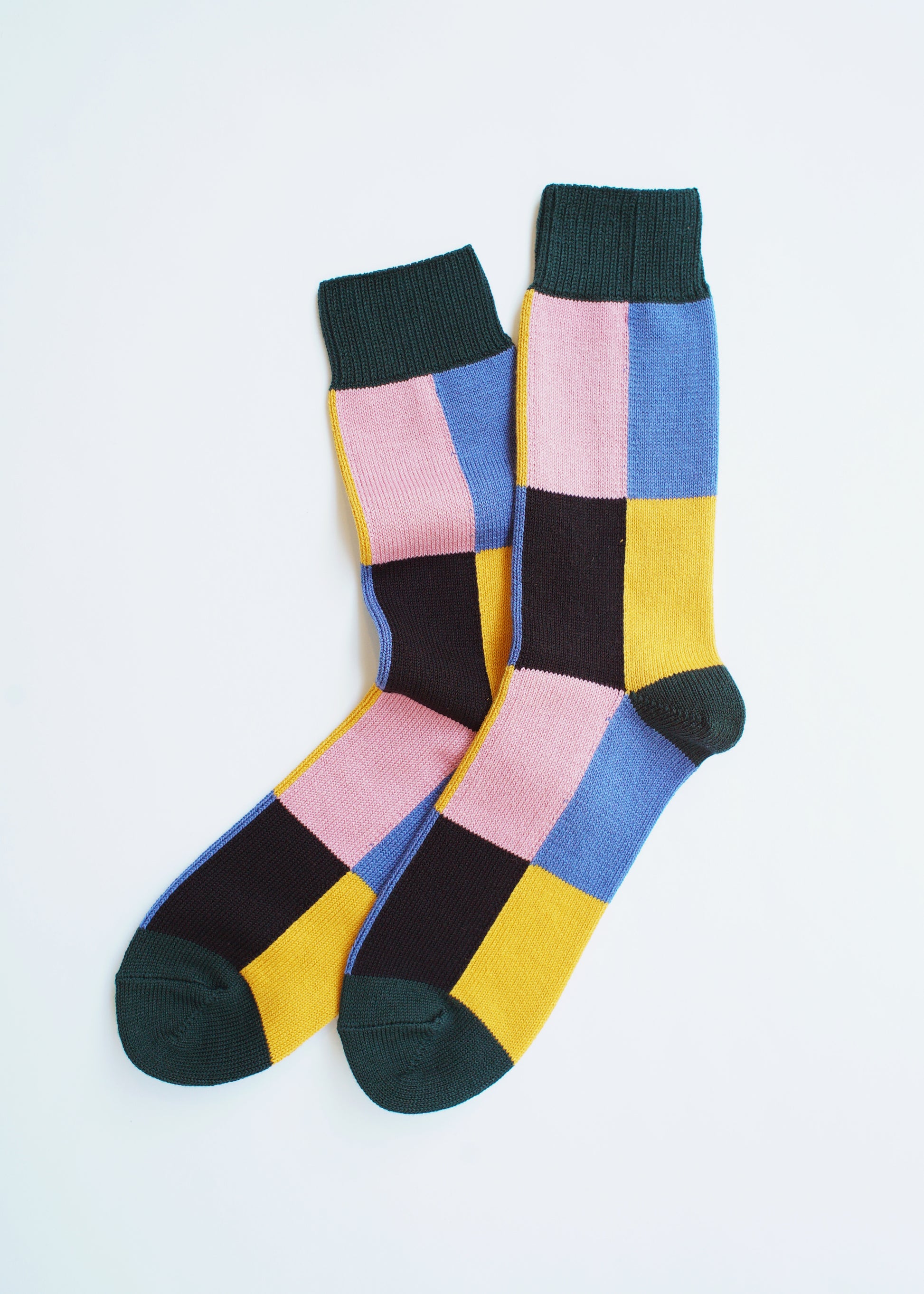 Designed with four different color blocks, these organic cotton socks give a vivid accent between pants and shoes. A special machine is used to knit the pattern with intarsia to make the surface even and smooth for a comfortable touch. Because of its specificity, intarsia knitting requires much more time than ordinary knitting methods, but can minimize yarn losses and reduce waste for processing.