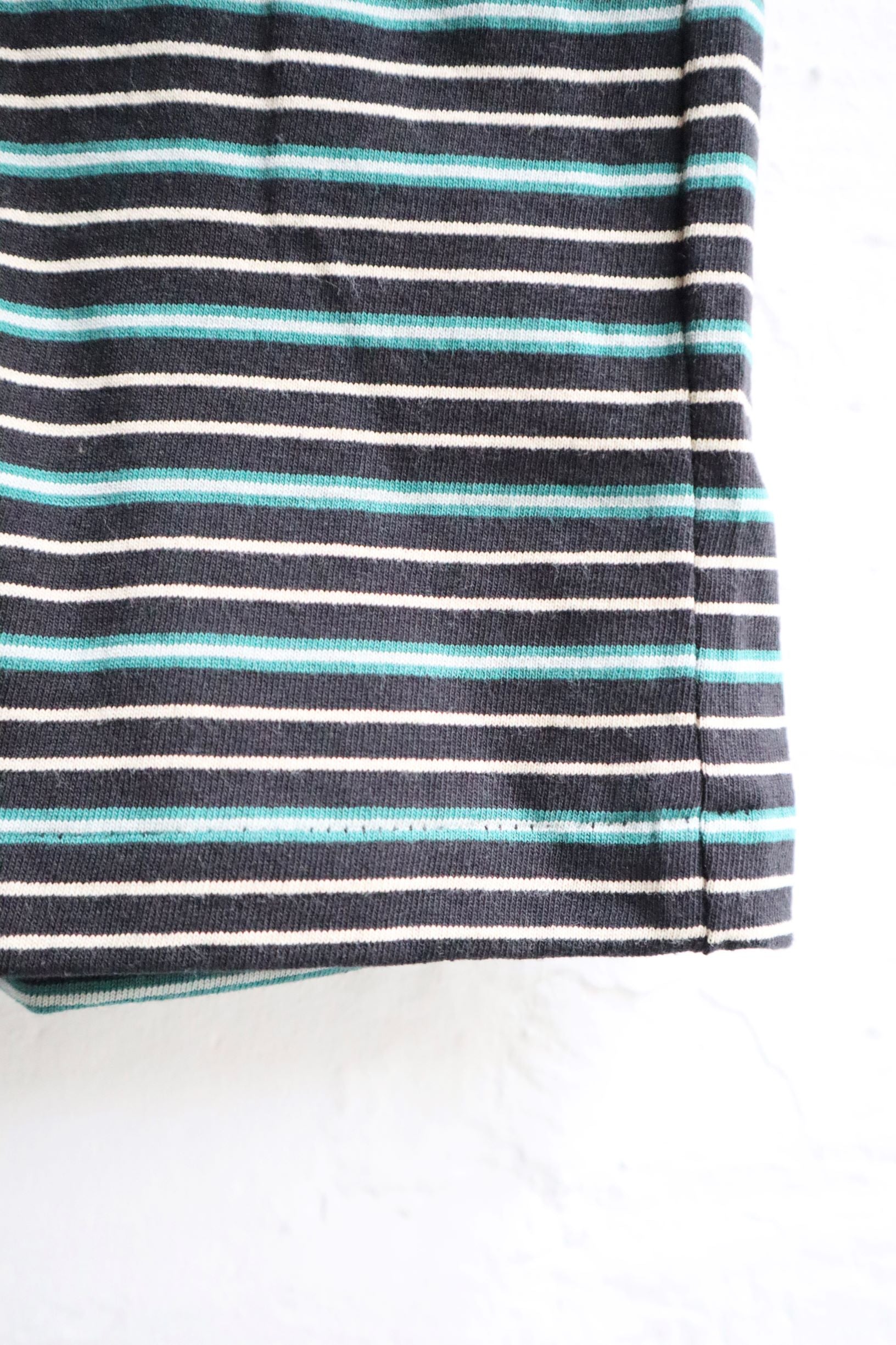 It features a border stripe consisting of Ecru, Turquoise and Black Stripes, and a medium sized Ecru Rib Crew Neck to match.