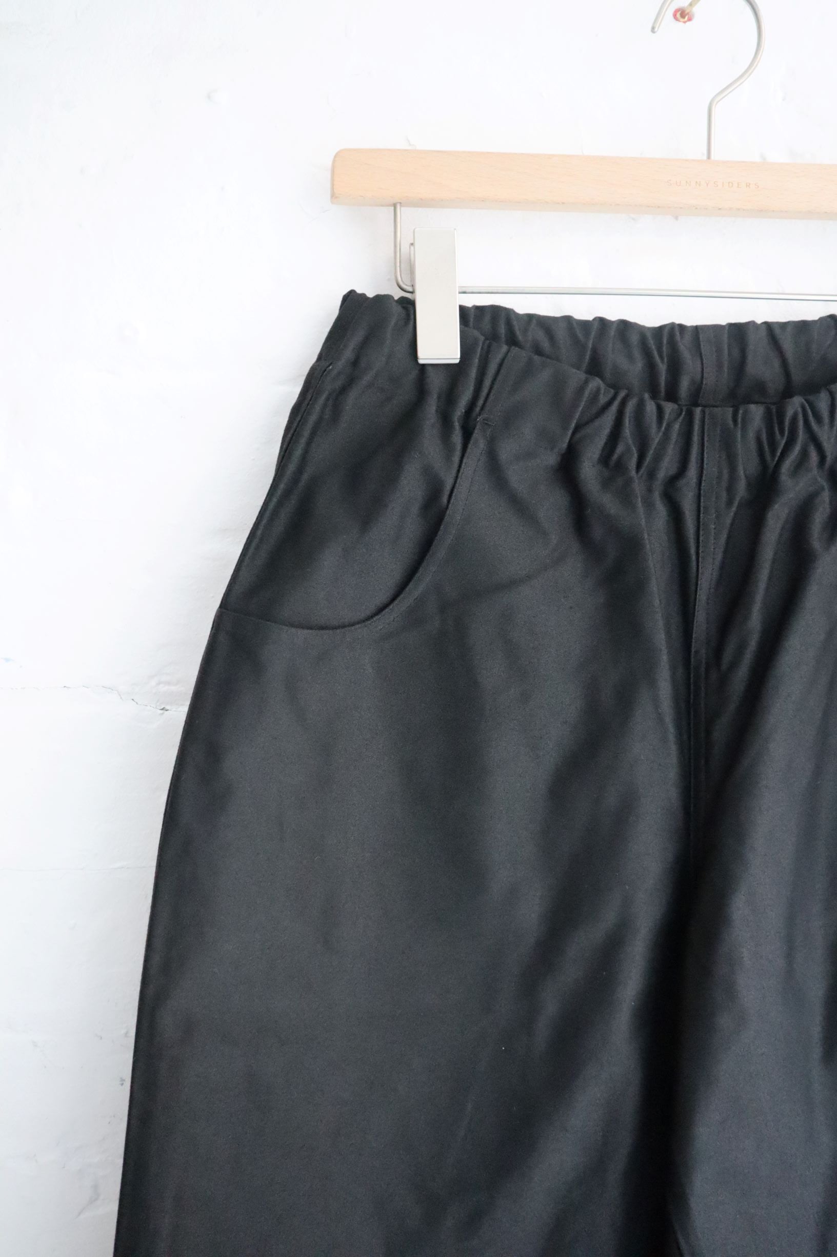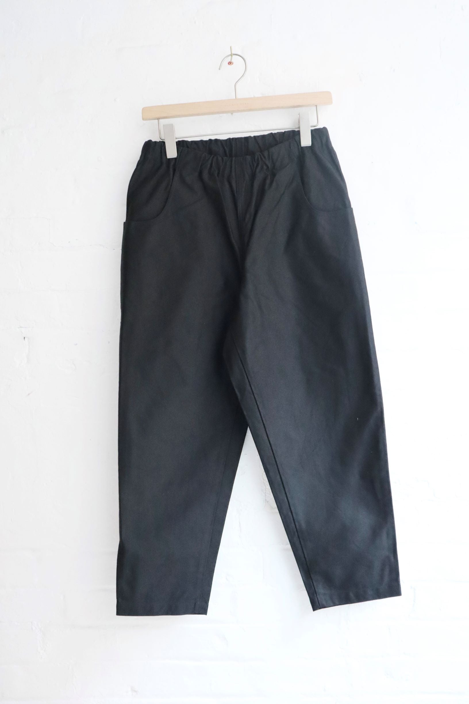 The Work Pant's style has a volume in the thigh with a gradual taper to the cuff. It's a relaxed style by nature with it's elasticated drawstring waist so it can be worn true or oversized depending on your style. It has curved front pocket openings and a single gusseted back pocket.