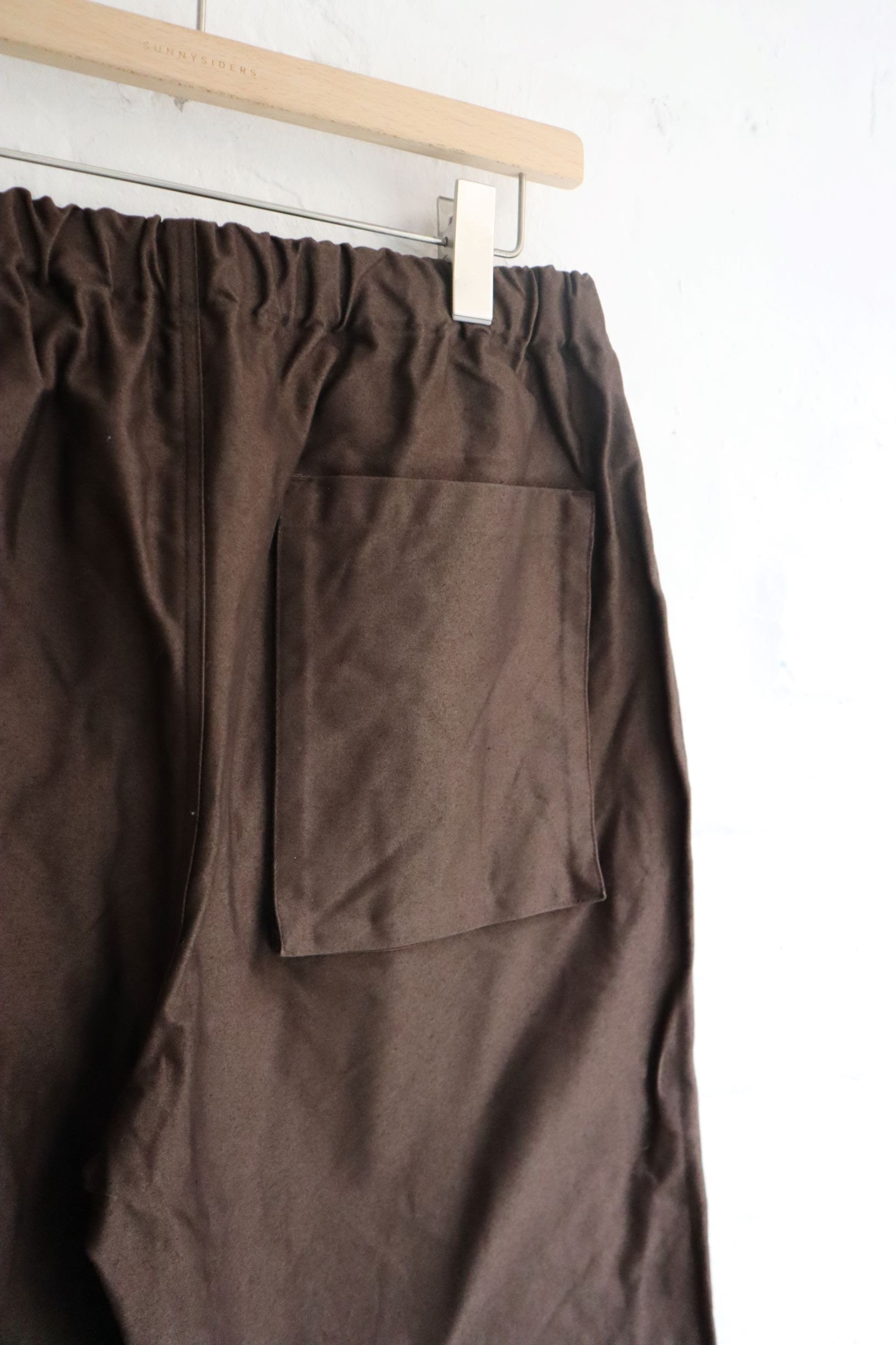 The Work Pant's style has a volume in the thigh with a gradual taper to the cuff. It's a relaxed style by nature with it's elasticated drawstring waist so it can be worn true or oversized depending on your style. It has curved front pocket openings and a single gusseted back pocket.