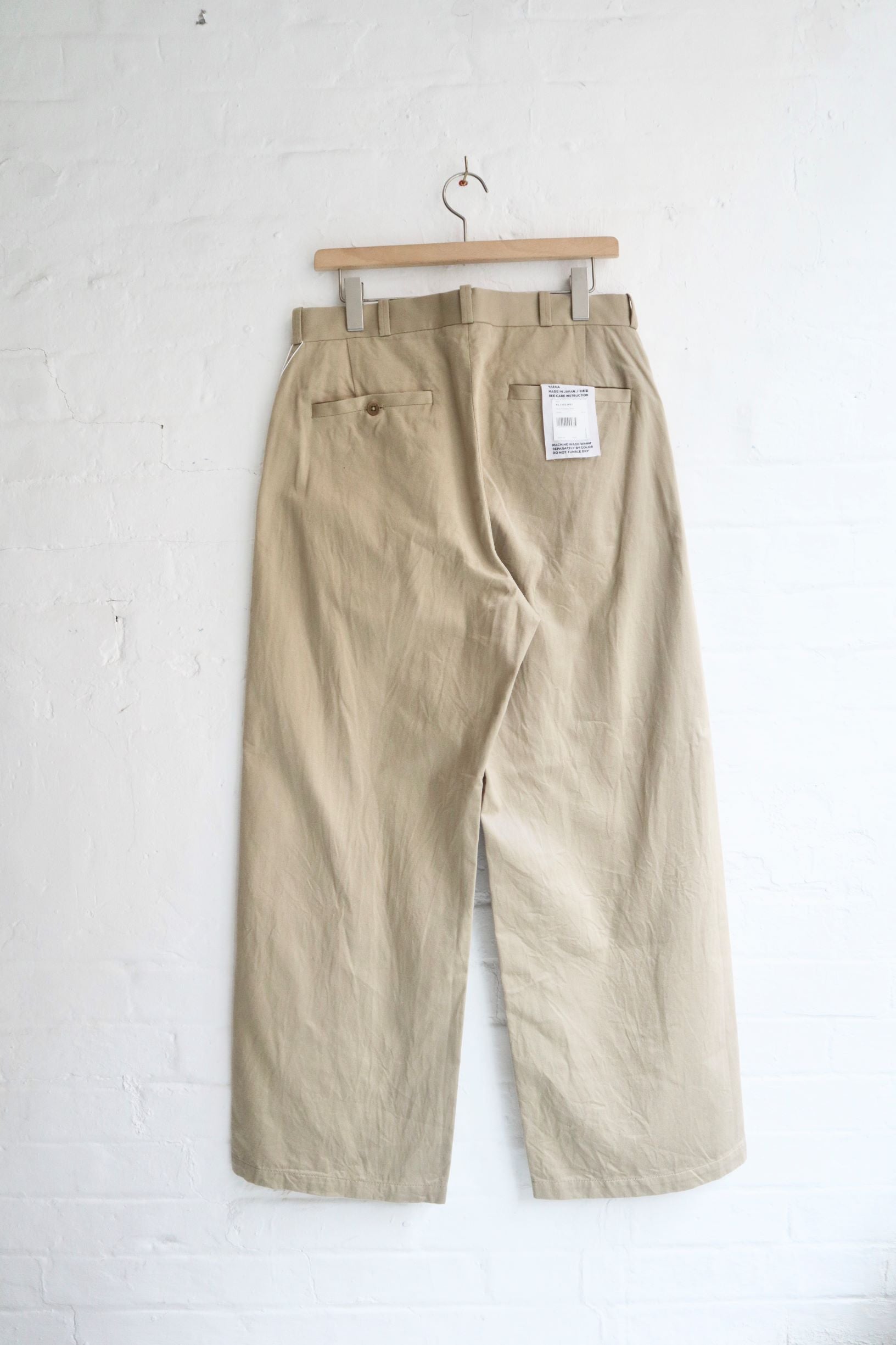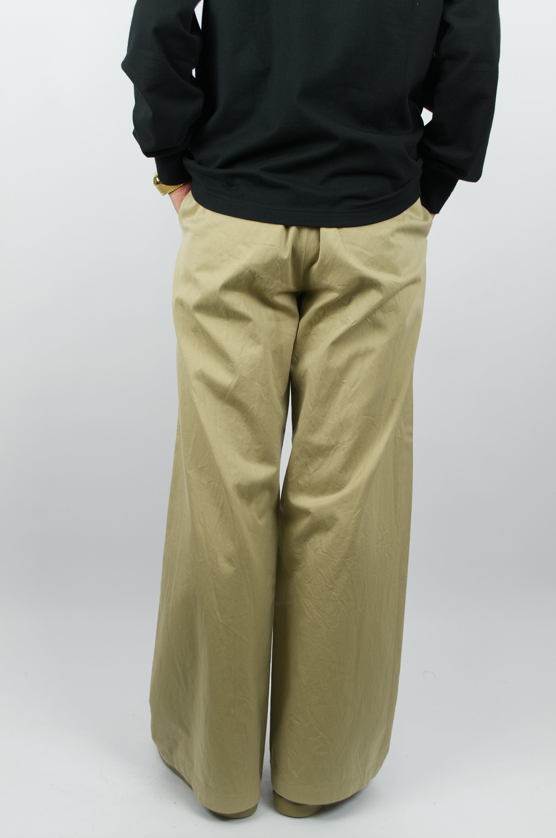 Yaeca's Widest fitting Chino Trousers. The silhouette spreads from the waist to the hem resulting in an elegant look capturing that of vintage Marine Pants.