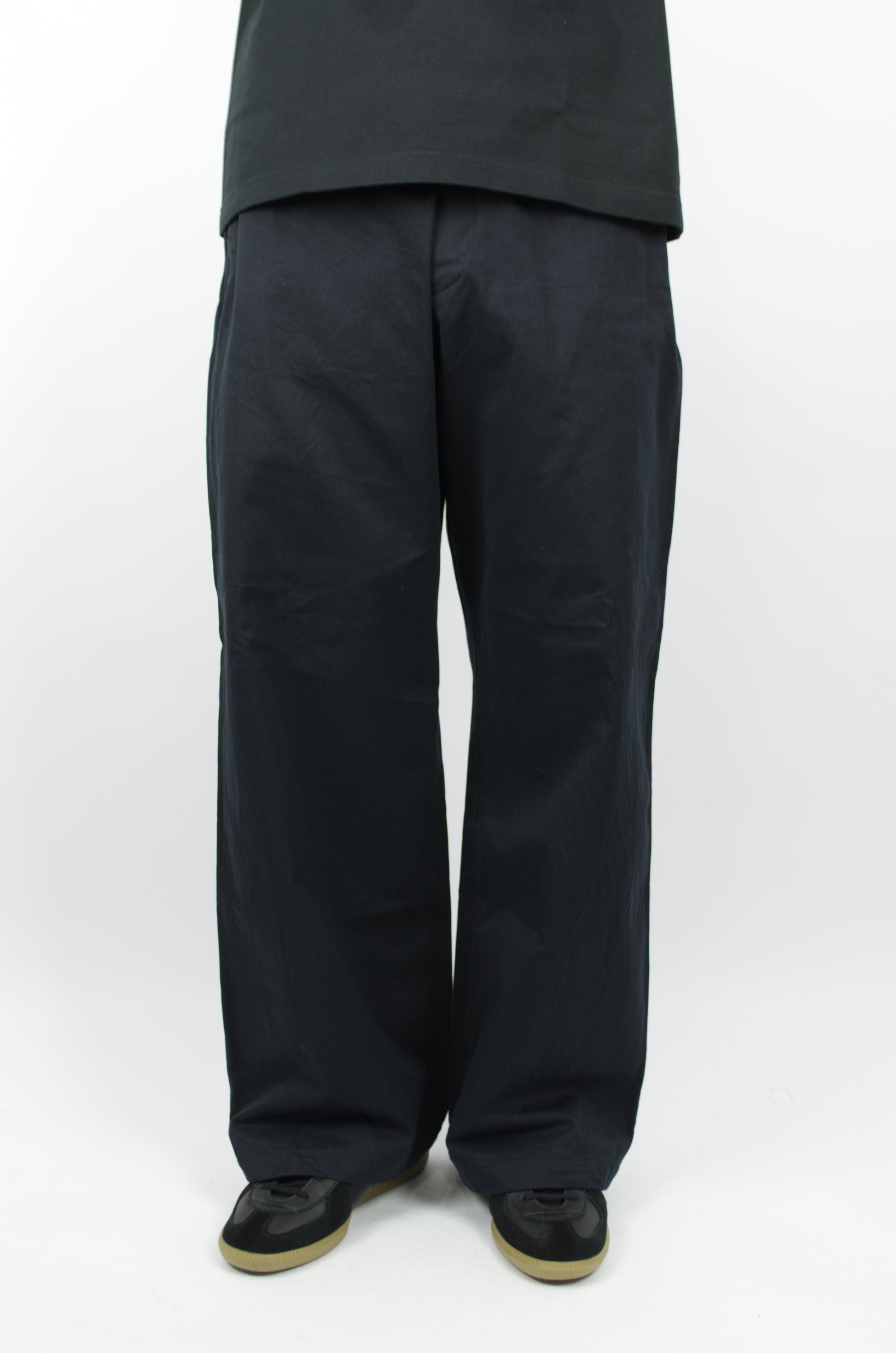 Yaeca's Widest fitting Chino Trousers. The silhouette spreads from the waist to the hem resulting in an elegant look capturing that of vintage Marine Pants.