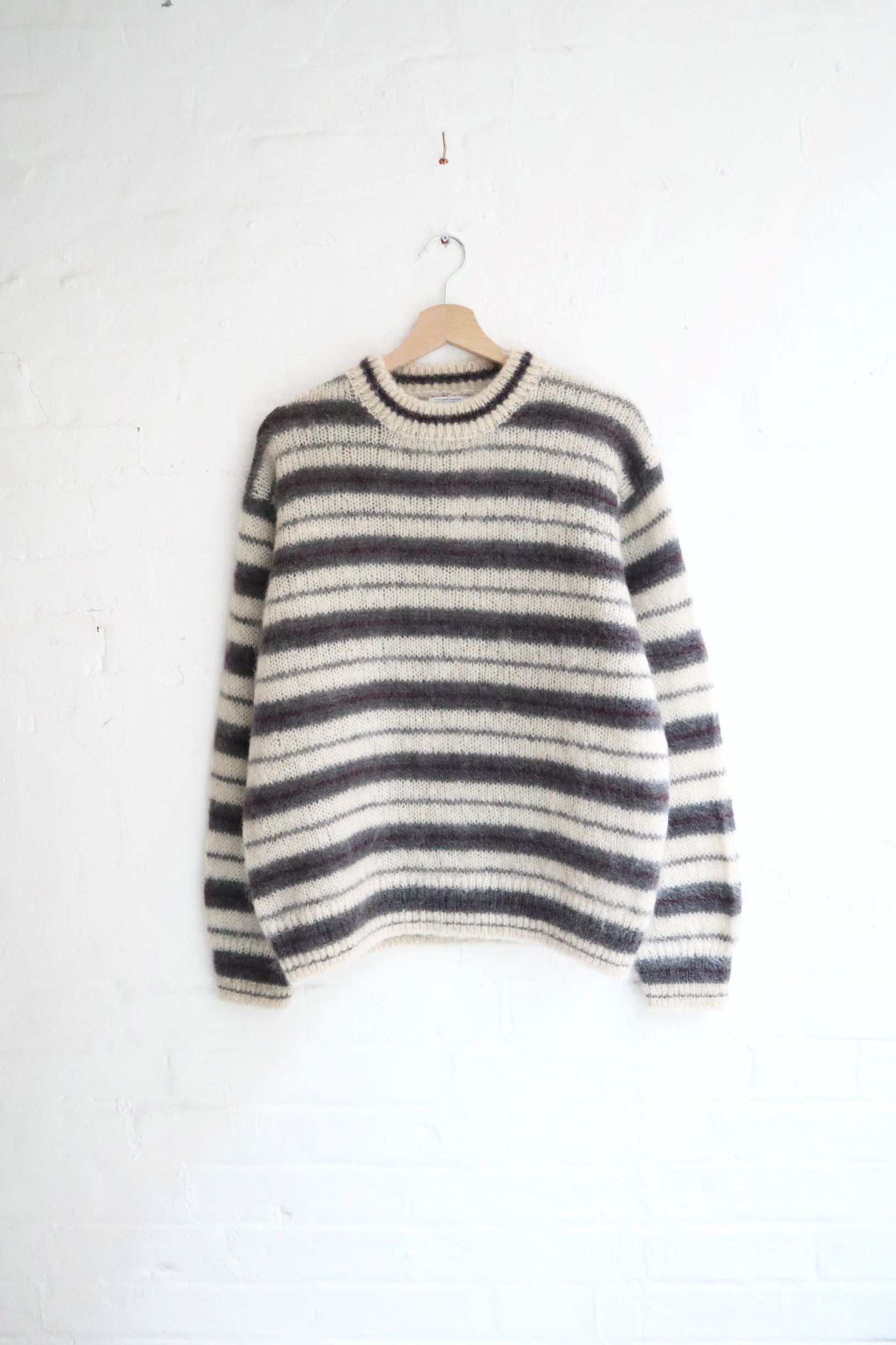 Inspired by mid-century mohair jumpers, these Border Knits from Yonetomi are extremely soft, made from a low-gauge and high-quality mohair wool. Available in Ivory or brown, they're cut in a moderately spacious and boxy silhouette. Woven with a bold retro striped pattern and characterised by an amazing lightness and texture typical of mohair, they hold all warmth you need for autumn and winter.